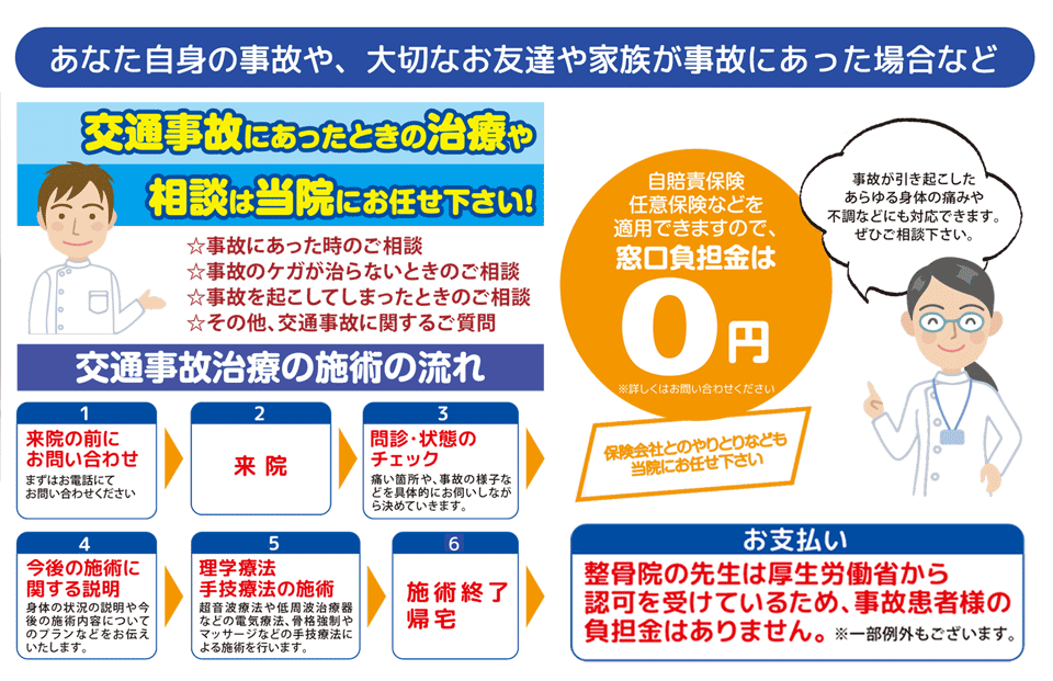 「接骨院」では、自賠責・任意保険などの交通事故による保険での施術が行えます。自己負担金は0円です。